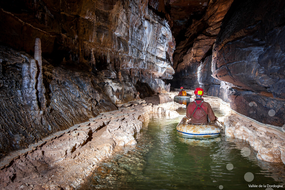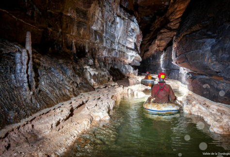 Spéléologues sur leur canot pneumatique, au retour de l’expédition, au Quai aux fleurs, le dimanche 19 octobre au matin. Expédition St Georges – Padirac réalisée du 16 au 19 octobre 2014.